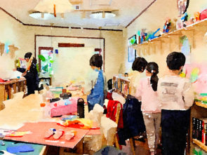 児童養護施設の子どもたちとの絵と工作レッスン。今回は、粘土でゆるキャラを作りました。レッスン最後にこの日、練習で描いたゆるキャラの絵を見せながら、それぞれが考えた名前や住んでる所、性格、夢などを紹介しました。