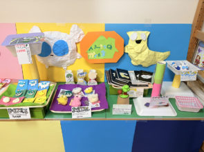 第2週になりました。いよいよ佳境です。今日は、お店(展示台)の制作、商品説明(値札)の作成、飲食物の企画をしました。展示台は4枚のボードに、自分のキャラクターのオブジェ、店名、キャラクターの紹介、商品置き場(生活廃品を利用)、値札など、複雑な構成になっています。