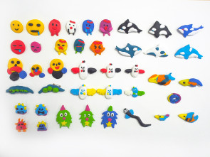 こどキャラレッスンの子どもたちの商品です。子どもたちの成長の軌跡である商品をご紹介します。自分で創作したキャラクターをピンバッジにしました。ラベルも自分でデザインしました。ご覧ください。