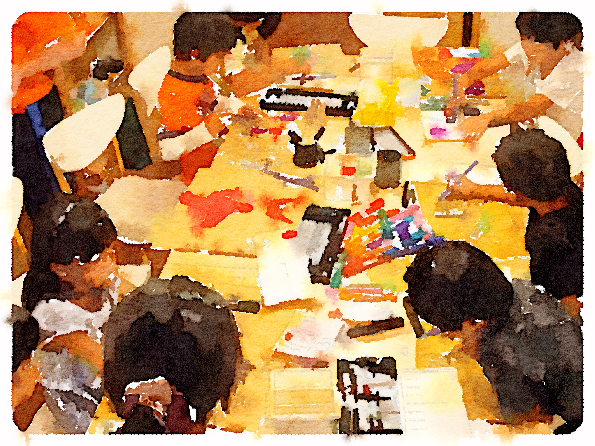 絵本作り。全体の構成案が決まり、着色作業に入りました。お話の落ち付けや辻褄を合わせるのに苦労しました。難関を乗り越えて、いよいよ色塗りです。