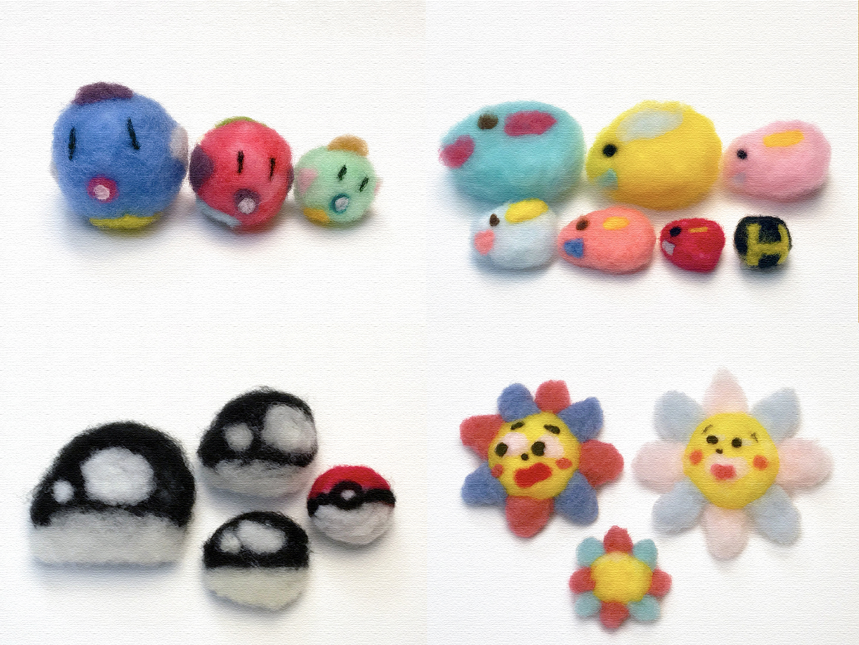 エステル綿で土台を作り、そこにアクリルの色糸を針で刺し、形作っていきます。最初はうまくいかず、「めんどい、嫌〜、無理〜」と言っていました。しかし、要領を得ると、次第にエンジンがかかり始めました。すると、ある子が自分の完成キャラクターを皆に見せました。