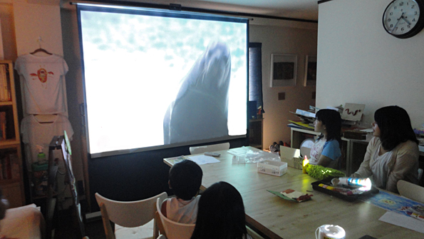 子どもデザイン教室自慢の大きなスクリーンです。生きものの映像からいろいろな創造をかき立てます。アシカに襲われるペンギンを見て、ぽつり。『どうぶつもたいへんやな〜』