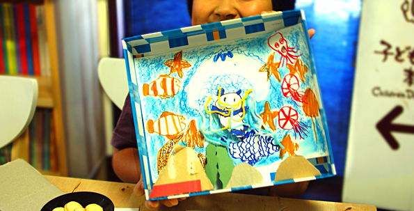 Jくんの工作「水族館のクラゲ」ができました!スタッフのゆっこさんが大好きなパンダがクラゲに捕まっています。お菓子の箱に入れるだけで、立体的な世界が現れます。どれもこれも、なんだか不思議ですね。