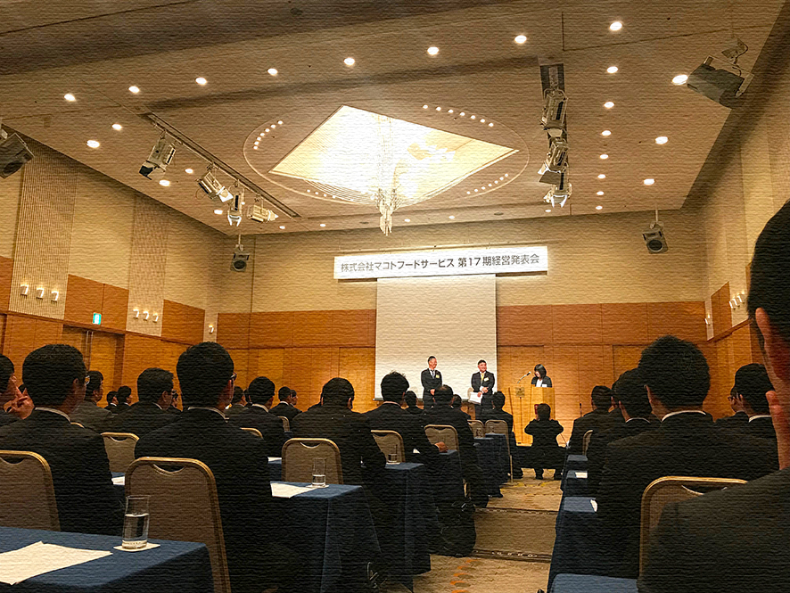 牛骨ラーメンチェーン店・まこと屋を展開するマコトフードサービスの経営発表会にお招き頂き、子どもデザイン教室の活動を講演しました。まこと屋さんとは協同で児童養護施設を訪問し、ラーメンと似顔絵を振る舞うボランティア活動をしています。
