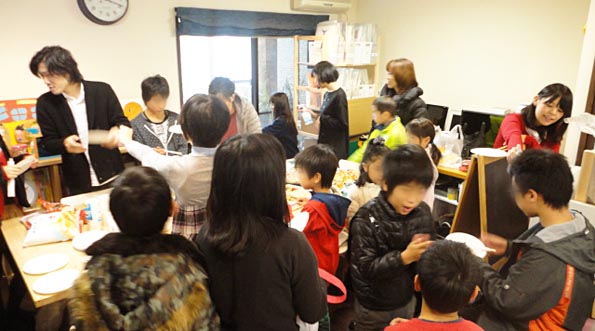 子どもデザイン教室のクリスマス会・第1弾が終了しました。子どもたちの人数が多いので、来週と2回に分けての開催です。ボランティア・スタッフの皆さんの手料理・ケーキ、差し入れの焼き菓子や果物、たくさんのごちそうに囲まれました。