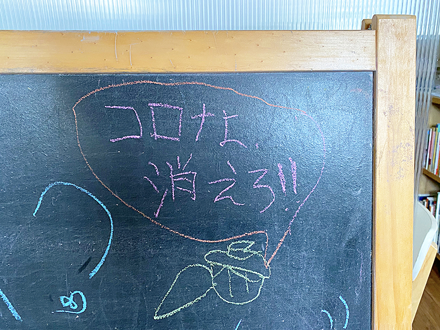 教室の黒板の何気に書かれた「コロナよ消えろ!」の文字。そういえば今期、子どもたちがやたらとおとなしくなりました。これまで「なあ、聞いて!」と言わないと騒いで話を聞かなかった子どもらが、成長したのか、コロナのせいなのか、静かにじっとレッスンをしています。