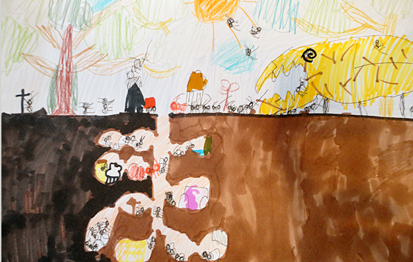 将来、漫画家希望のNくんとTくん、果たして世の中に黒色の影はあるのか?実験してみました。Tくんはすっかりおとなの頭になっていて、ガチゴチの線を描くので、どうすれば子どものような線が描けるのか?実験しました。