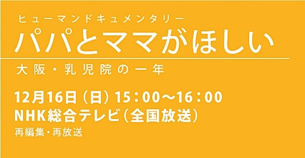 12月16日(日)15:00〜16:00、NHKの全国放送で、乳児院の子どもたちの番組「パパとママがほしい」が放送されます(8月に関西地方で放送された番組の続きを取材したものです)。