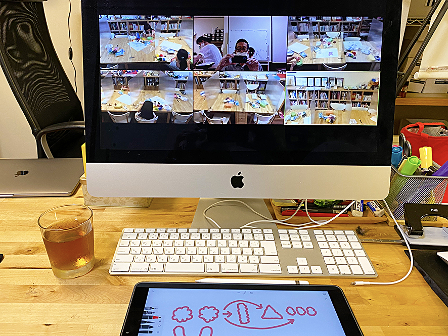 【Real+Remote Lesson】リアルなのにリモートなレッスン。子どもデザイン教室では、レッスン中、離れていても子どもたちの動きが分かるように、カメラを設置してレッスンしています。対面のリアルを感じつつ、しかも蜜にならないよう工夫して、手元にある機材を駆使しています。