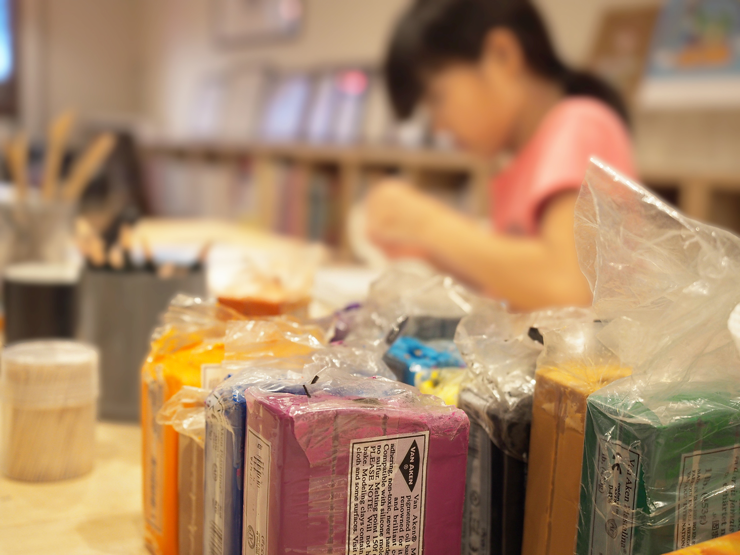 レッスン「ピンバッジをデザインしよう」をしています。まず最初に油粘土で試作品を作ります。その後、陶器粘土で本制作をします。レッスンは1回切りのパフォーマンスではなく、同じ事を色々な方法で何度も繰り返すところにポイントがあります。