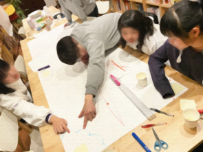 今年最後のデザイン国語研究レッスン。ディスカッションゲームをしました。大きな画用紙の上に自分の意見と相手の意見の合意位置を皆で指さしし、合意範囲(エリア)を形成します。こうすることで合意の状態を見える化します。