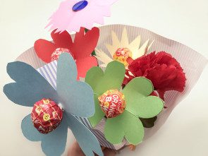 土曜日の造形工作レッスン。「明日は何の日?」「母の日!」ということで、お母さんに贈る花束を作りました。4つに折った画用紙を切って花びらを作るところでは、どんな形になったかドキドキしながら開きます。思った形にならず何度も挑戦する子も。ラッピングまでして完成です。