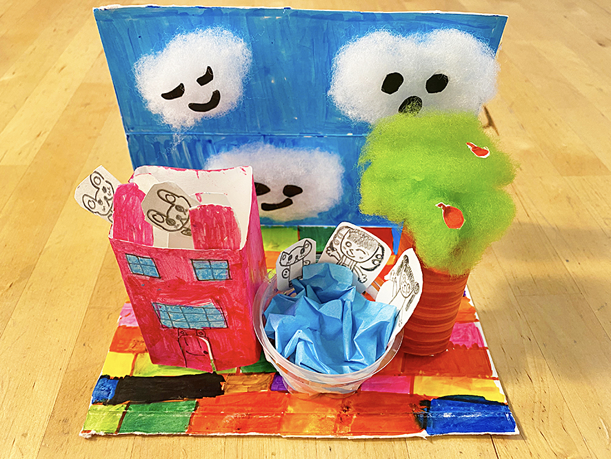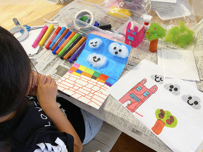 8月の創造デザインレッスン。自分の考えたキャラクターが住む世界をテーマパークのアトラクションに見立て、ジオラマ作りをしました。今回は設計図をiPadで描き、それを元に廃材を工夫して工作しました。再現力の高さに驚きます。来月は皆の前で発表し、対話力に結びつけます。