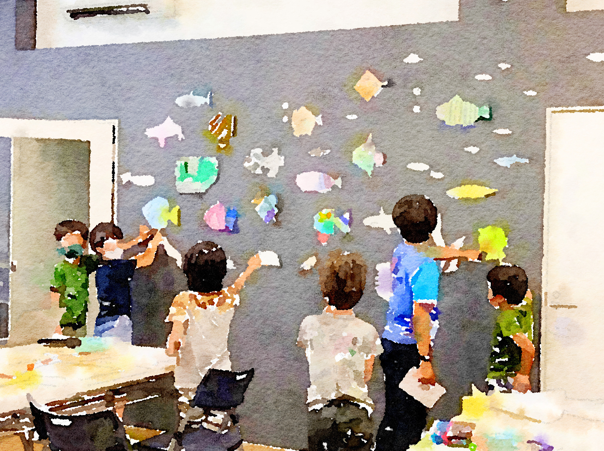 うだるような暑さの日曜日。ちょっとでも涼をと夏の水族館を作りました。丸や三角形などの型紙にポスカや色鉛筆で色を塗り、魚状に切り貼りすると自分だけのお魚の完成です。出来た魚を大きな黒い壁に貼りだすと、壁一面が水族館になりました。
