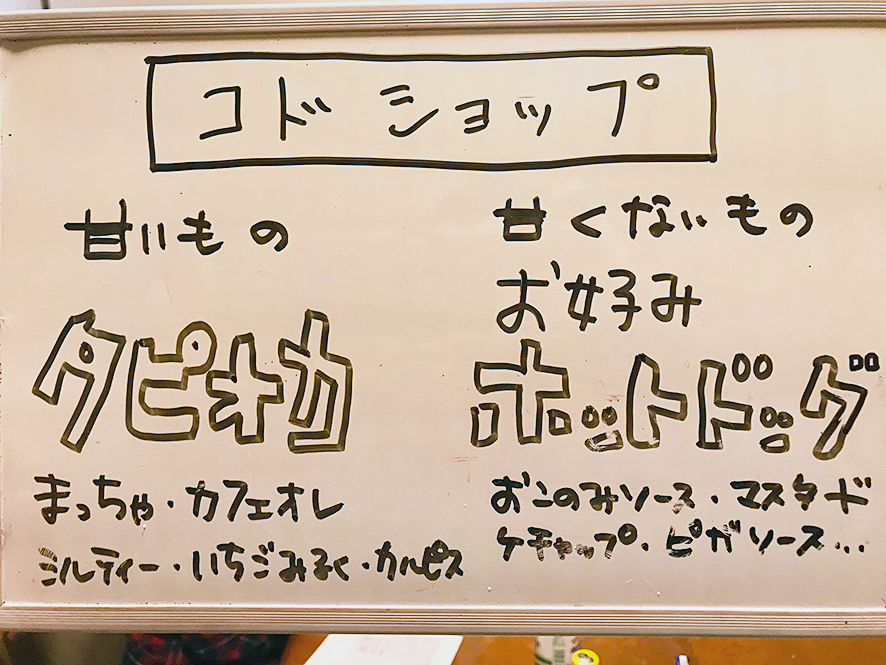 3月22日㊐の販売会に出店する飲食ブース。「安心安全、おいしい食べたい、簡単早い、甘い甘くない」食べものって何?を話し合い、メニューはタピオカとホットドッグに決定。このレッスンは単なるバザーの企画ではなく、販促や対話の観点から達成感、自己肯定感を醸成します。