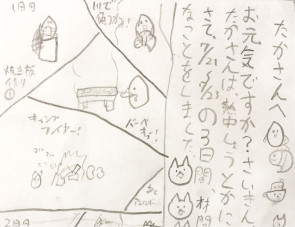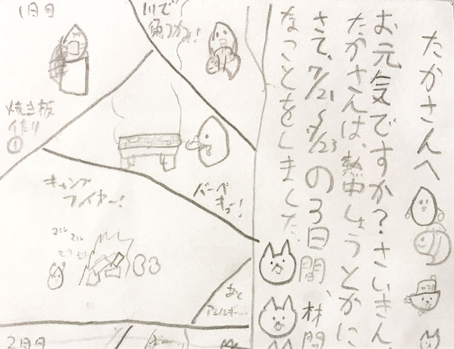 子どもたちは夏休みの真っ只中、来る度に真っ黒になっていきます。教室もどこかのんびりムードです。そんな折、林間合宿先からの暑中葉書。聞けば旅先から誰か一人にお便りを出さないといけなかったそうで、その子が選んだ誰か一人がこのたかさん。嬉しいじゃあ〜りませんか!