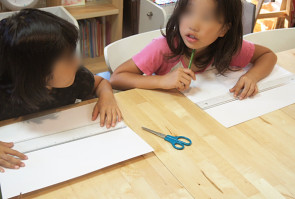 数学カルタ自体にもいろいろ仕掛けがありますが、その前にものさしを使いながら自分で数学カルタを作ります。まずはものさしを使って割り算から。こうして数と遊びながら算数好きな子どもを増やしていこうと企んでいます。