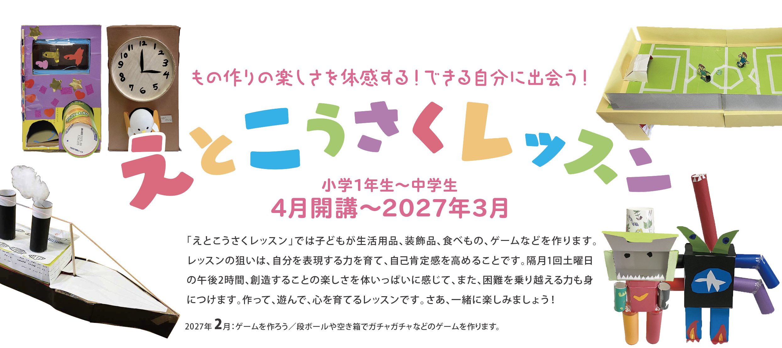 「えとこうさくレッスン」では子どもが生活用品、装飾品、食べもの、ゲームなどを作ります。レッスンの狙いは、自分を表現する力を育て、自己肯定感を高めることです。年6回土曜日の午後2時間、創造することの楽しさを体いっぱいに感じて、また、困難を乗り越える力も身につけます。作って、遊んで、心を育てるレッスンです。さあ、一緒に楽しみましょう!