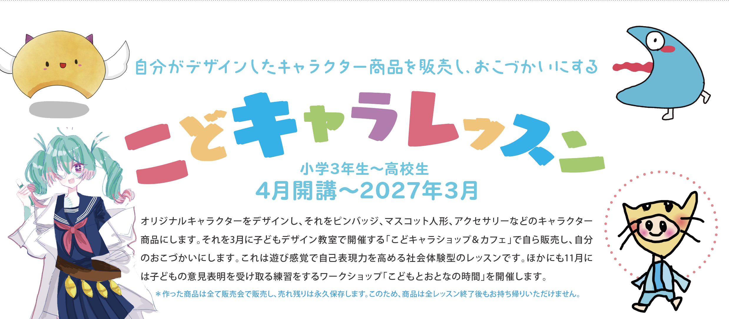 オリジナルキャラクターをデザインし、それをピンバッジ・マスコット人形・アクセサリーのキャラクター商品にします。それを3月に子どもデザイン教室で開催する「こどキャラショップ&カフェ」で自ら販売し、おこづかいにします。ほかにも11月には自分のお薦めする絵本を論理的にプレゼンテーションすることで、意見表明の練習をする発表会「言葉で描く絵本の世界」を開催します。