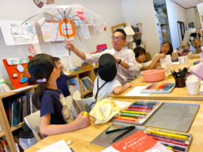 梅雨のシーズン。雨を楽しもうと6月前半は雨傘のデザインをします。デコパージュで柄を切り貼りしたり、ポスカペンで絵を描いたりします。今回はデザイン案を描きました。空から振ってきてほしいものは?と聞くと花、星、おもちゃとの答え。カラフルなデザイン案ができました。