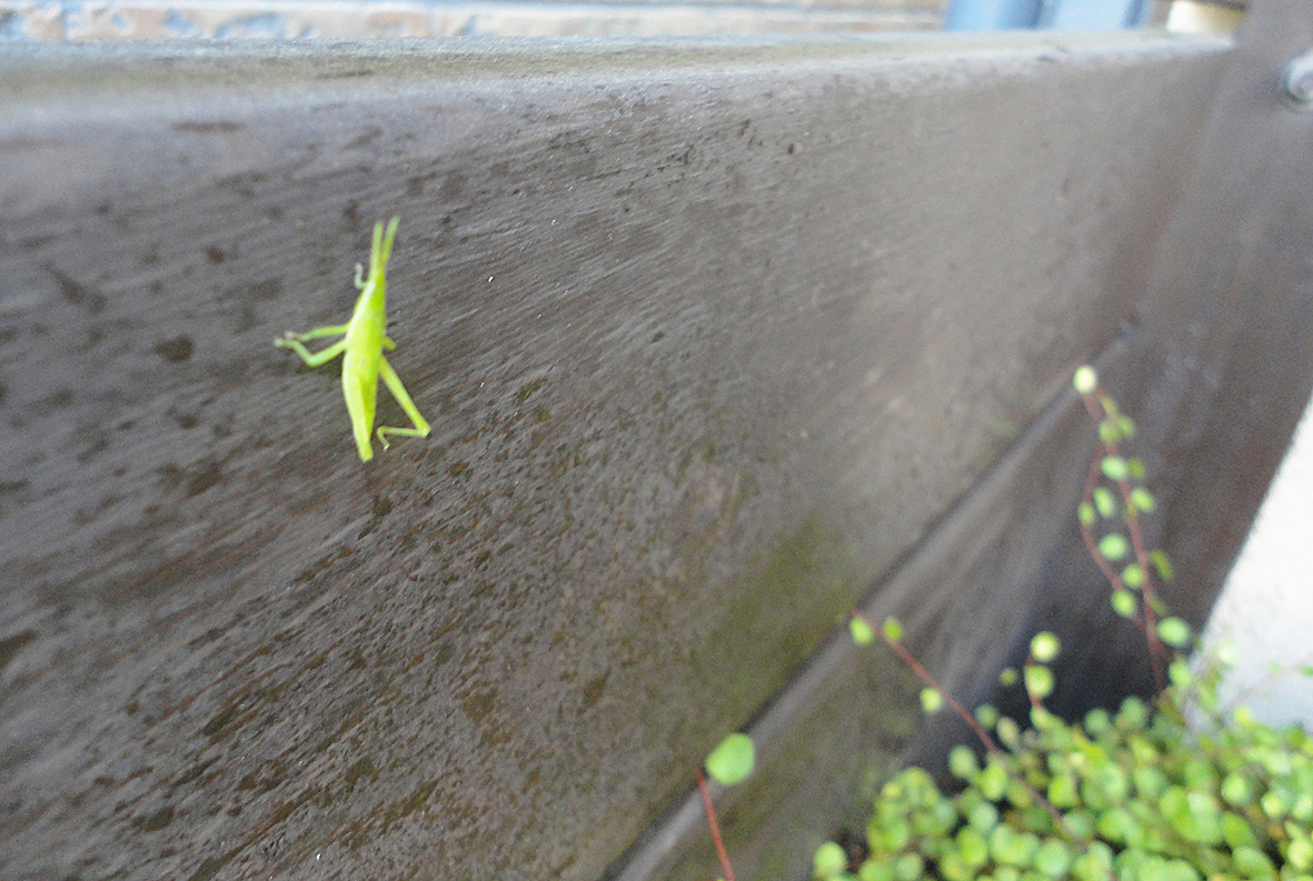 我が家の小さな植え込みの住人・バッタくん。今日も元気です。我が家には色んな生きものが暮らしておりまして、2階のベランダには蜂の巣とカマキリの卵(毎年孵ります)、南側の植え込みにはヤモリ、1階にはハエトリグモのマーフィー、、、