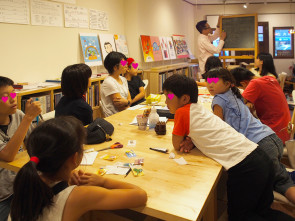 木曜日のもう一つのグループも絵本作りをしています。主人公のモチ猫は恋人のメイちゃんに出した手紙が届きません。そこできのこのキノとブラックホールの中に探しに出掛けます。そこからお話は4次元ポケット、光を隠せない箱の中、夢の中へと変わります。