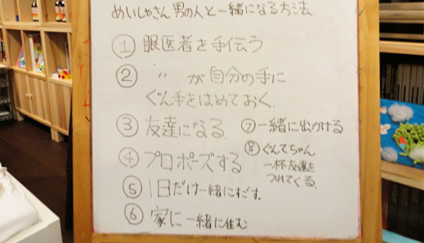 そこで、みんなにお話の続きを提案してもらいました。人のことならみんなもアイデアがポンポンでてきます。最後にHちゃんが恥ずかしそうに『⑥家に一緒に住む』とボードに漢字でていねいに書き、言ってくれました。やった〜!