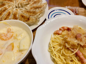 祝日の夕食。子どもに何食べたい?と聞くと、おとうのパスタ!おとうのフルーツサラダ!王将のぎょうざ!とバラバラのリクエストに応えて、一貫性のない夕食になりました。自分でいうのも何ですが、どれも美味しかったです。とりわけぎょうざが上手に焼けて、自画自賛の夕食になりました。