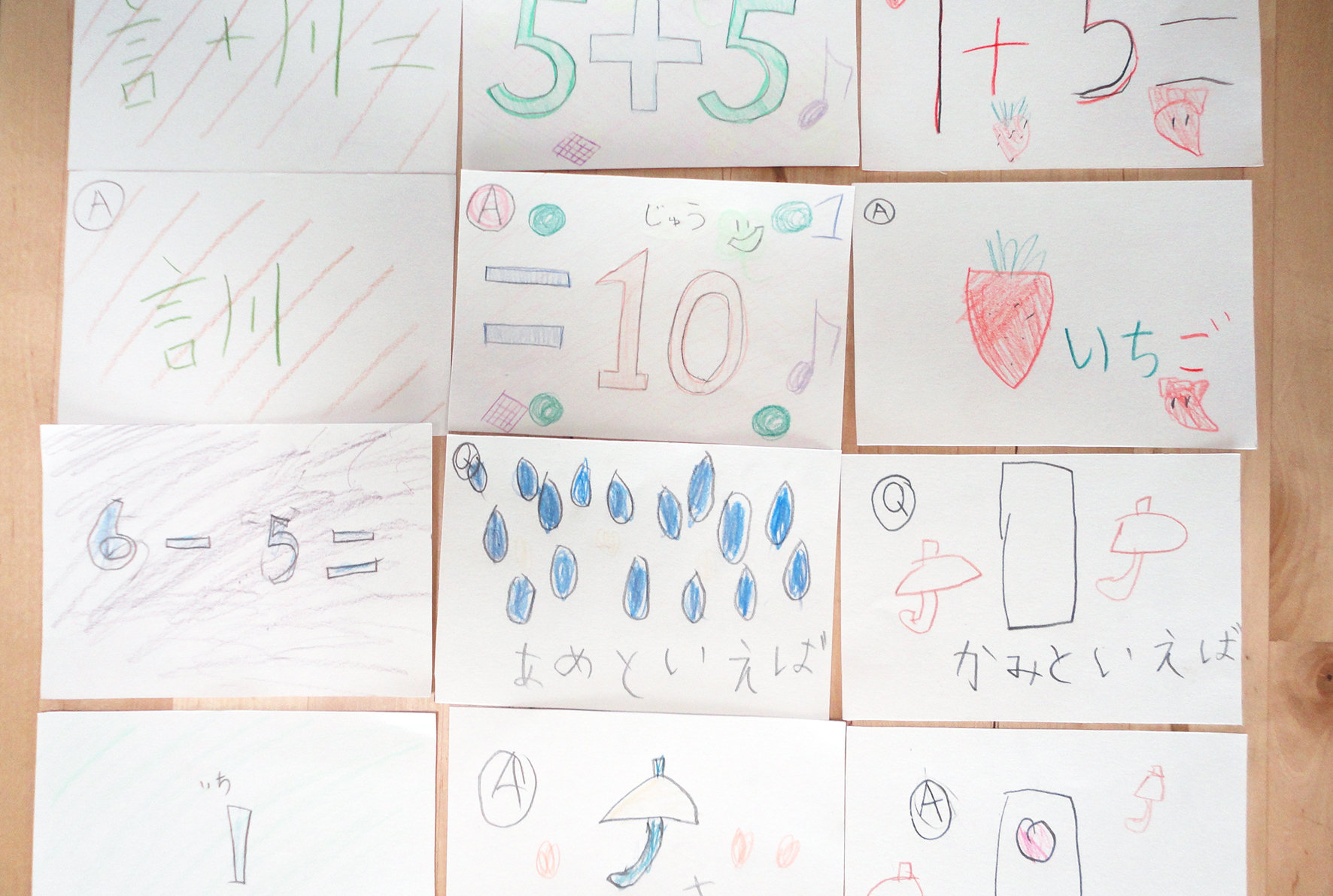 子どもデザイン教室。先週のアイデアを「見える形=ラフスケッチ」にして現実のデザインに近づける作法を体験しました。わかるかなカルタは算数4題、国語1題を自分で考え、答えるカルタ。