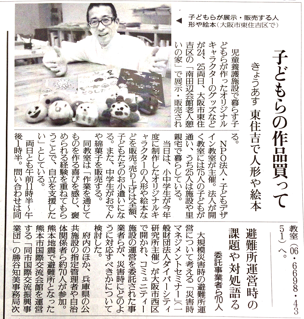昨日の読売新聞に子どもデザイン教室の発表会の記事がのりました。今日25日㊐は11:30~13:30、南田辺会館 老人憩いの家(地下鉄御堂筋線西田辺駅下車、1号出口を出て、南港通りを東へ500m直進)で開催しています。ぜひお越しください。