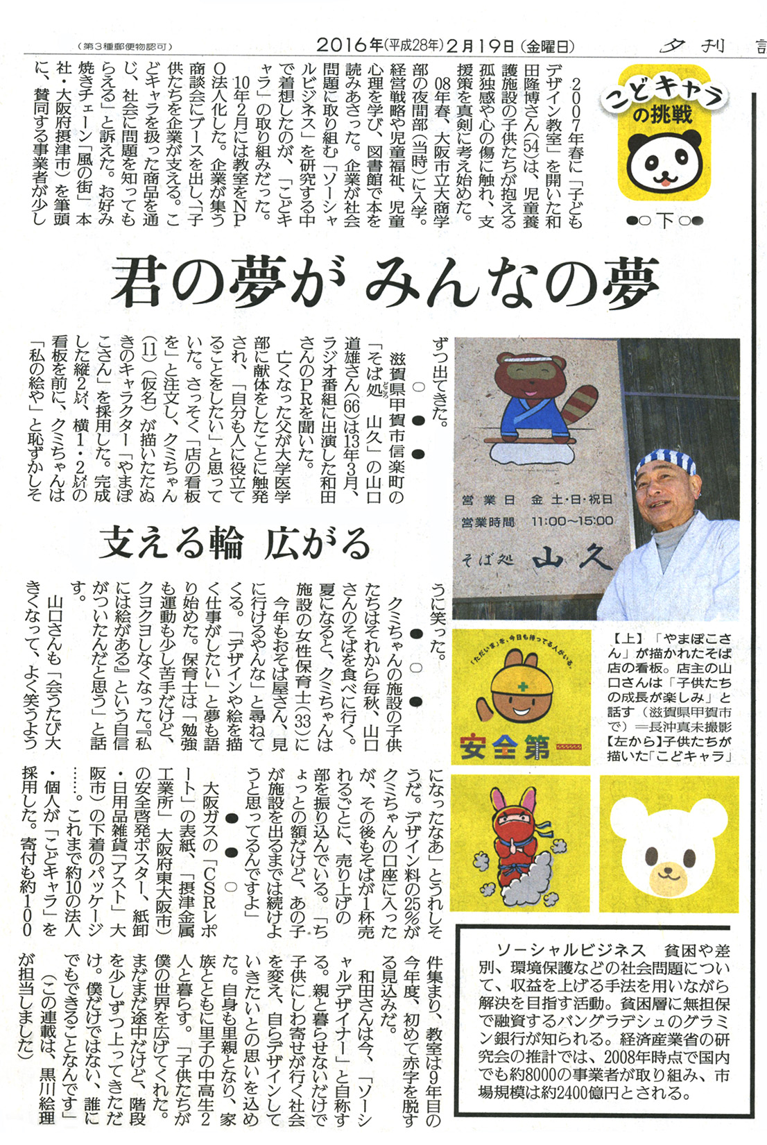 読売新聞夕刊社会面に3日間連載されている「こどキャラの挑戦」。今日は下編・最終回です。今日は、あまえたクミちゃんのお話しです。恥ずかしがり屋のくみちゃん、友だちに「デザイン教室で働きたい」と夢を話しているそうです。