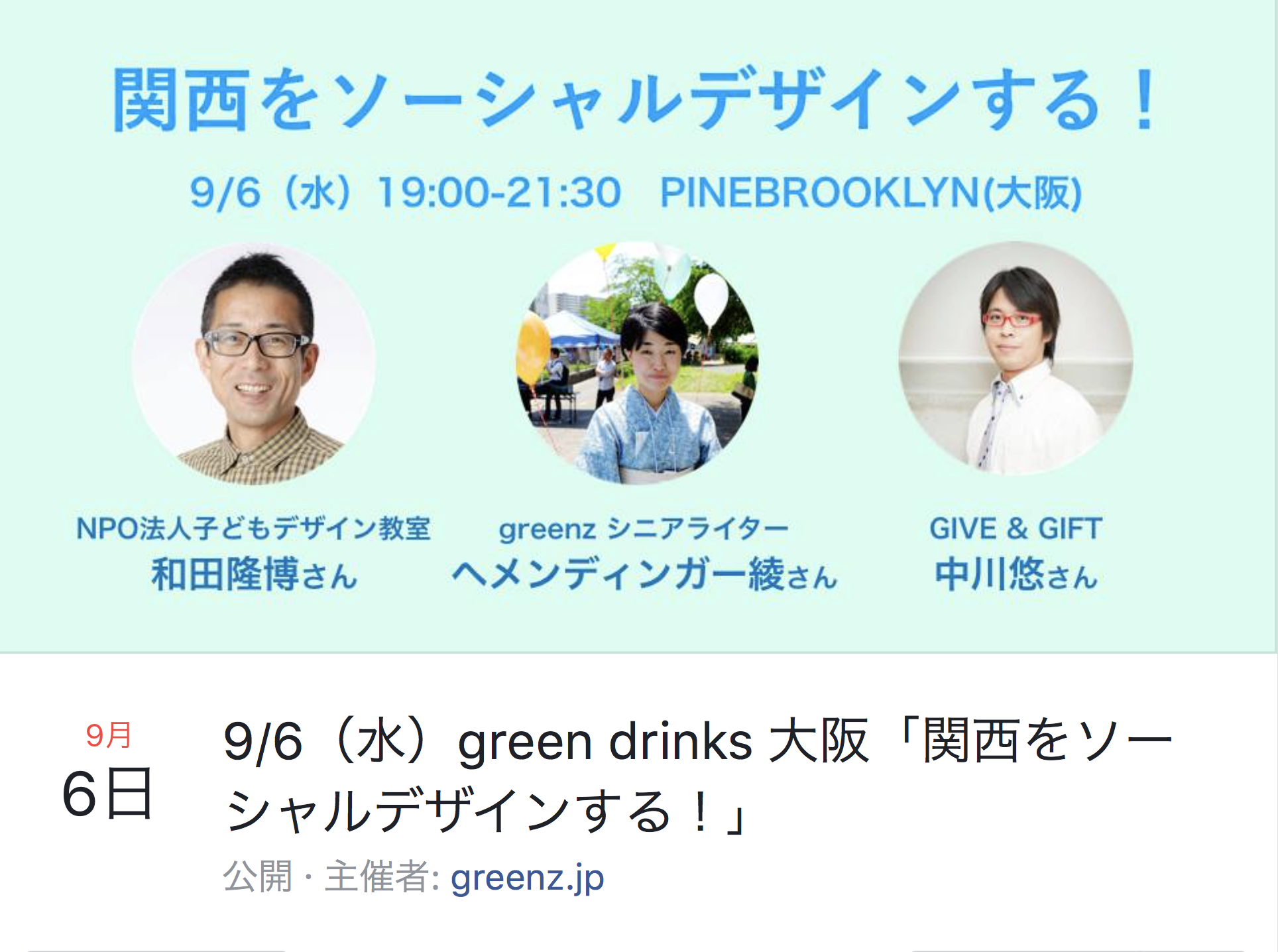 本日、green drinks 大阪「関西をソーシャルデザインする!」のトークセッションでお話させて頂きます(但し、タイトルのような大それた事を、私はしておりませんので、予めご承知置きくださ〜い)。
