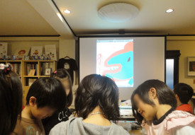 絵本作りの合い間を見て、面白い取り組みをしています。みんなでお題を決めて、1人30秒で何周かして1枚の絵をPCで描きます。アイデアの出にくい子はどんどん描けるメリットがある反面、集中できない子はせっかくの絵をメチャメチャにしてしまいます。