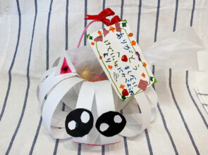 10月はハロウィンクッキーとそれを入れるバスケットを作りました。バスケットはかぼちゃ、おばけ、キャラを好きな色で自由に作りました。クッキーには自分への応援メッセージか、誰かへの感謝の言葉を書き添えます。皆自分の思いを時間をかけて書いていたのが素敵でした。