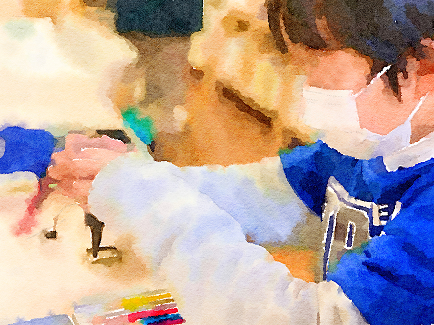 新年度レッスンの原型となる「自分の気持ちをネックレスにする」レッスンをしています。これは身につけるネックレスで思い出を見える化するアイデアです。旅行やお出かけなど、楽しかった思い出をいつ、どこで、誰と、と文章にし、それを色鉛筆で好きな色と形の模様に描きます。
