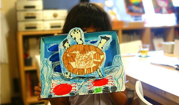 夏休みの工作ができはじめました。Hちゃんのウミガメ。一瞬の映像をよく覚えていて、黒い斑点をよく描いています。子どもの観察力はいいですね。