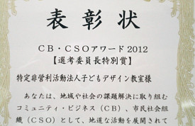 大阪商工会議所と大阪NPOセンター主催の「CB・CSOアワード2012」というビジネスコンペで「審査委員長特別賞」を頂き、その表彰式にいきました。副賞♪まで頂きましたっ〜!いくつになっても褒められるって嬉しいですね。
