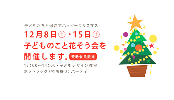 賛助会員・賛助会員ご希望の皆さまへ。もう12月、寒さが増すとともに、どこかウキウキしてきます。子どもデザイン教室では「子どものこと花そう会」として、「クリスマスパーティ」を開催します。