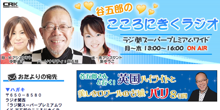 1月29日(火)13時20分頃から約10分間、ラジオ関西(AM558KHz)の「谷五郎のこころにきくラジオ」に出演します。個人的にはお恥ずかしい限りですが、子どもデザイン教室の代表として宣伝させて頂きます。生放送なので、粗相のないよう頑張ります、、、