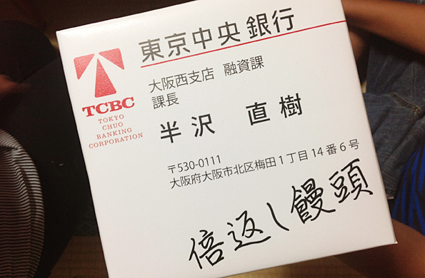 毎日放送の方に頂いた半沢直樹の倍返し饅頭。半沢直樹の名刺が入っています。おいしかったけど、あの終わり方はない、、、