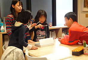 カリキュラム・つりゲームを進めています。自分の好きなアイテムをつってその合計を競ったり、つったもので新たに何かを作ったり、アイデアは様々。このレッスンの肝は最後に自分の考えを文字にして相手に伝える取り扱い説明書を作る点です。