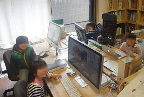 土曜日の午前中、滞っていたピクチャーブック(絵本作り)を再開しました。現代画法で描いた抽象画を下絵にし、それをコンピュータ描画に置き換える作業です。小学生を相手に同時に4人、イラストレータの指導ができるか!?挑戦しました。