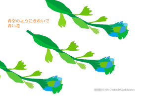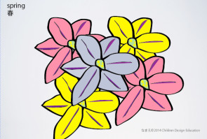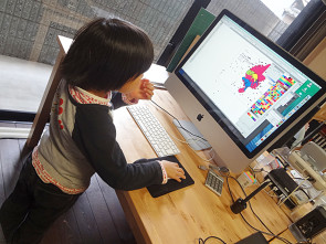 コンピュータの絵をさらに工夫して楽しい春の絵にしています。そこからイメージする文章を考えてほぼ完成です。1年生のHちゃん、イラストレータCS6を使ってます。しかも立ちながら、、