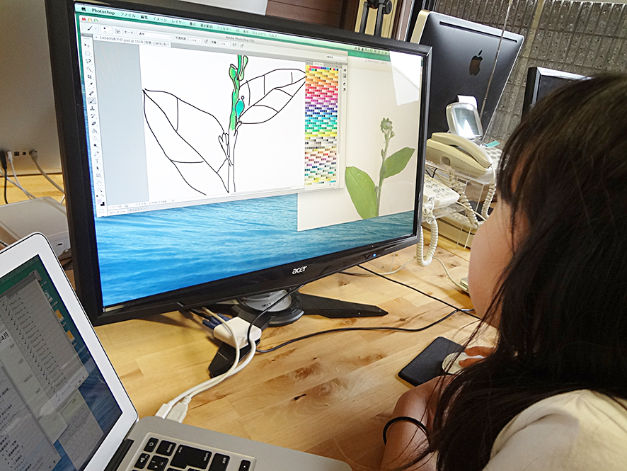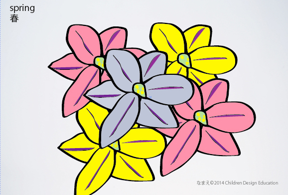 コンピュータの絵をさらに工夫して楽しい春の絵にしています。そこからイメージする文章を考えてほぼ完成です。1年生のHちゃん、イラストレータCS6を使ってます。しかも立ちながら、、