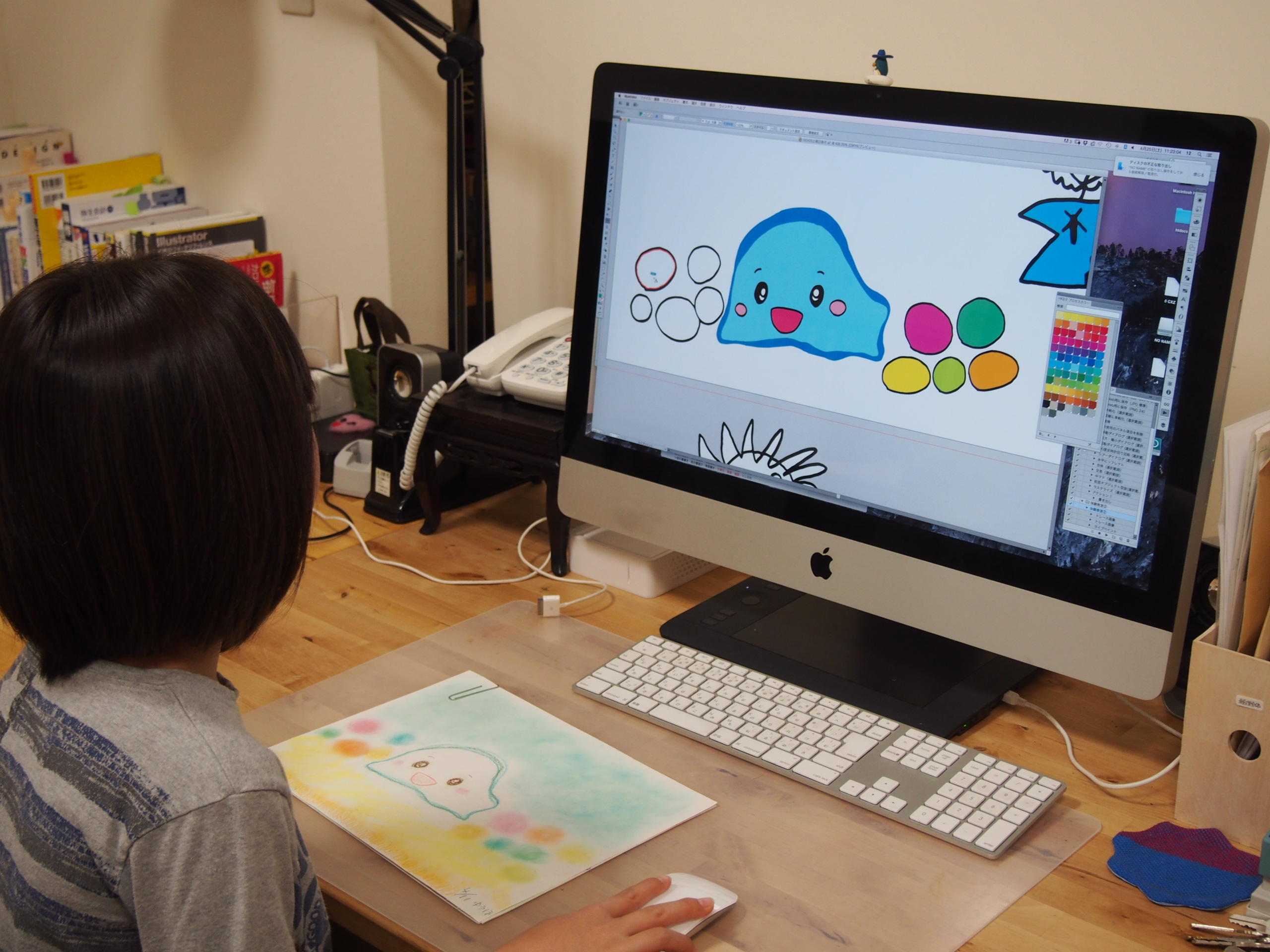 4月の第4クールが終了しました。今月の最終日、PCでの着色作業です。イラストレータというプロ用ソフトを使いました。まずは操作に慣れるようにしています。順番待ちの子は先週の絵を完成させました。