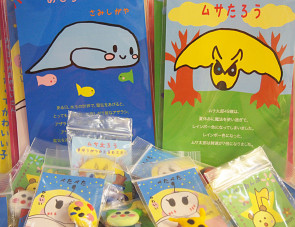 写真右、ムサ太郎49歳は、夏休みに魔法を使い過ぎて、レインボー色になってしまいました。写真左、水玉の世界に住む寂しがり屋なアザラッシーは、身長50cm。だけど、電気をあびると100cmにもなります。