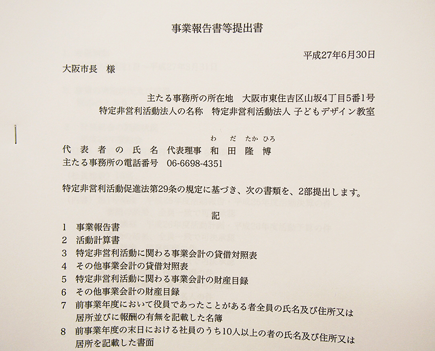 大阪市市民局に事業報告や活動計算書を提出した。法務局への手続きもしている。吹かなくても飛ぶようなNPOにすれば、まあ面倒な話だ。長らく会社法人を経営してきた身からすると、正直、なんでここまで?と思ってしまう。