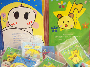 6月のレッスン「ポストカードをデザインしよう」の商品をご紹介します。写真左は「おもろおじさん」左は「パラシュートくん」。おもろおじさんは、すごくよく笑います。パラシュートくんは体長0.1mmだそうです。