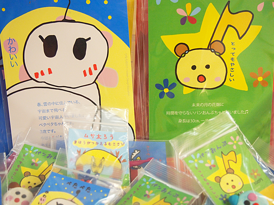 写真左は「ベタベタちゃん」。雲の中に住んでいる可愛い宇宙人です。3歳です。左は「パンおんぷちゃん」。時間を守らないパンおんぷちゃん、身長は30㎝。未来の月の花畑に住んでいます。