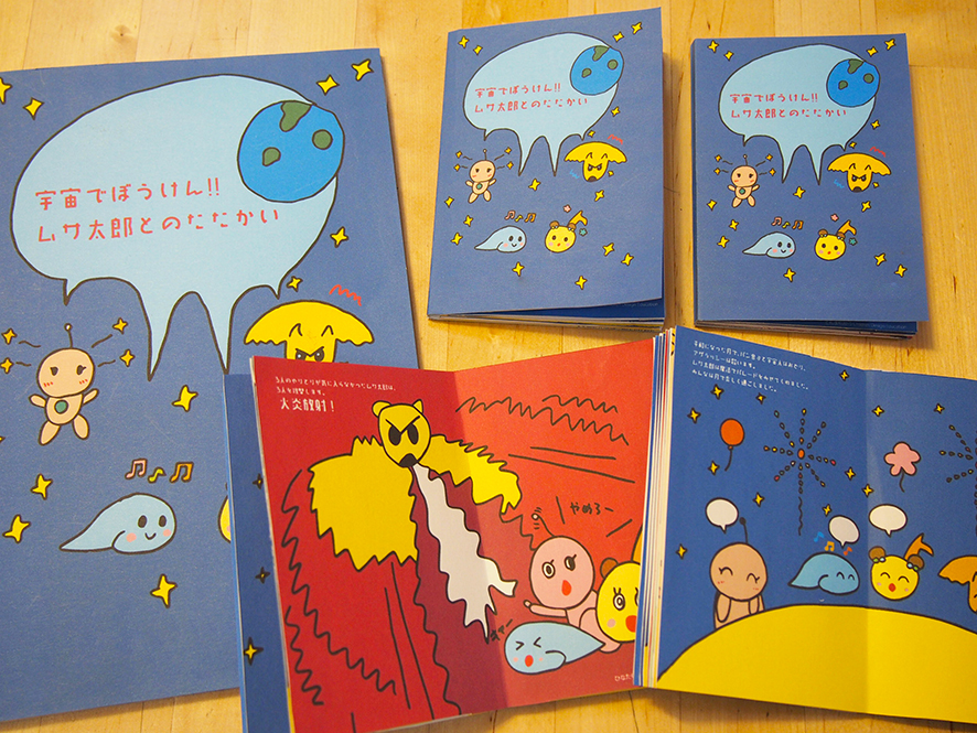 9月の子どもたちの商品、絵本をご紹介します。タイトルは「宇宙でぼうけん!ムサ太郎とのたたかい」。月を食べちゃった暴君ムサ太郎。立ち向かうのは月に住むパンおんぷ、アザラッシー、宇宙人。最後に巨大なラスボスが現れます!